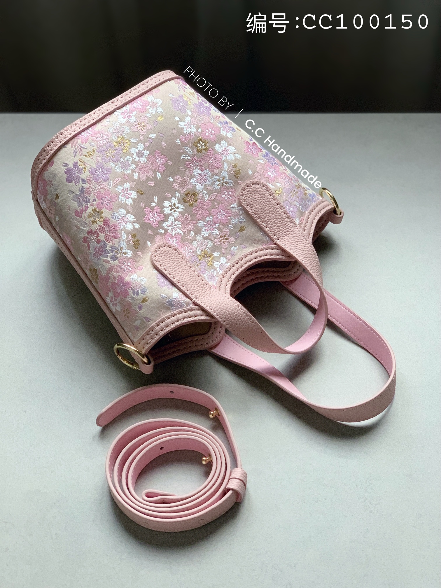 外部 :粉色头层牛皮+日本进口西阵织、皮搭扣作为开合。